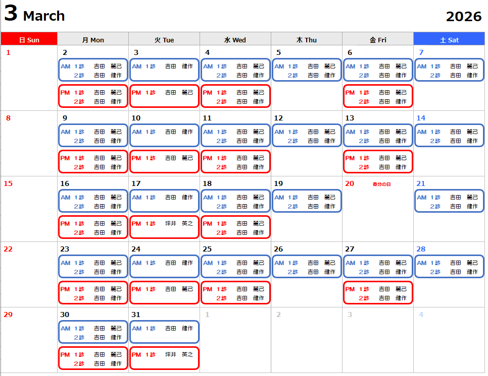 外来担当表 3月